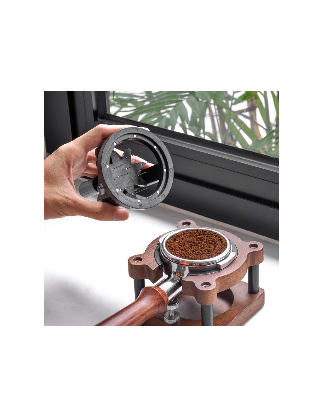 Kaffia WDT Premium V2 е иглен разпределител на кафе от висок клас, който издига приготвянето на еспресо на професионално ниво. Той разполага с фини игли от неръждаема стомана, които разбиват бучките смляно кафе и осигуряват равномерното му разпределение в лоста. По този начин се елиминира образуването на канали по време на екстракцията и се получава по-пълна, по-балансирана и с по-стабилен вкус напитка.