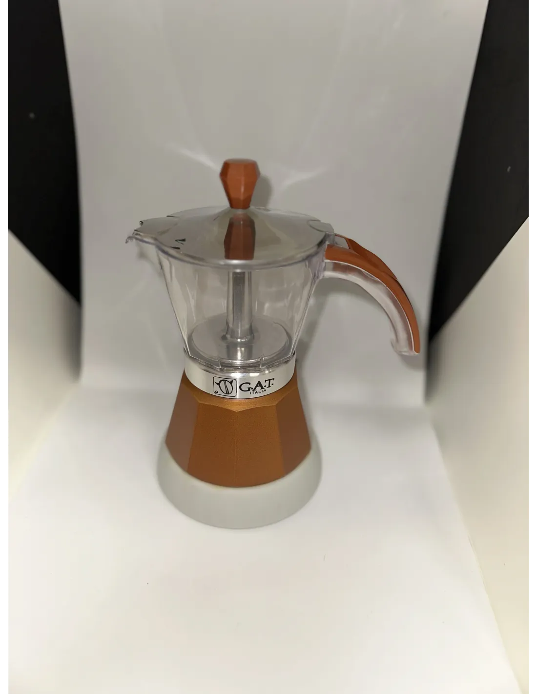 Електрическият мока кана G.A.T. Vintage с 4-6 чаши за приготвяне на силно и прясно кафе, където и да се намирате. Цвят: кафяв. Каната е използвана и без опаковка - ОТСТЪПКА.