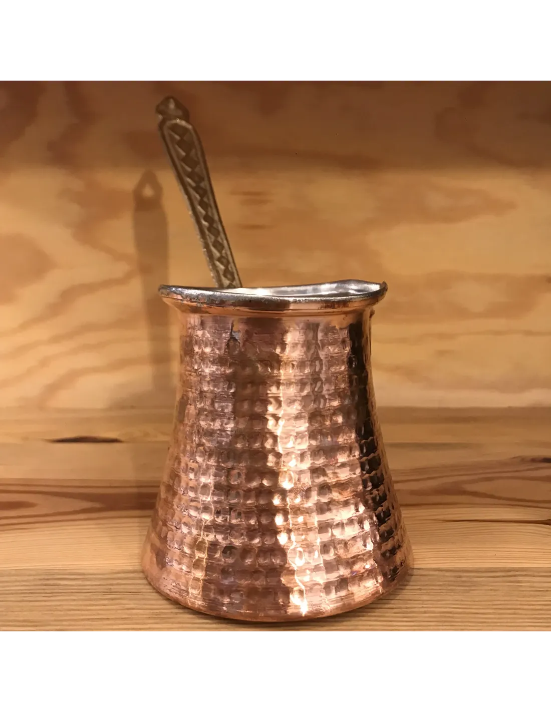 Ръчно изработена медна джаджава направо от турската провинция. Джазвата е изкована по традиционния занаятчийски метод.