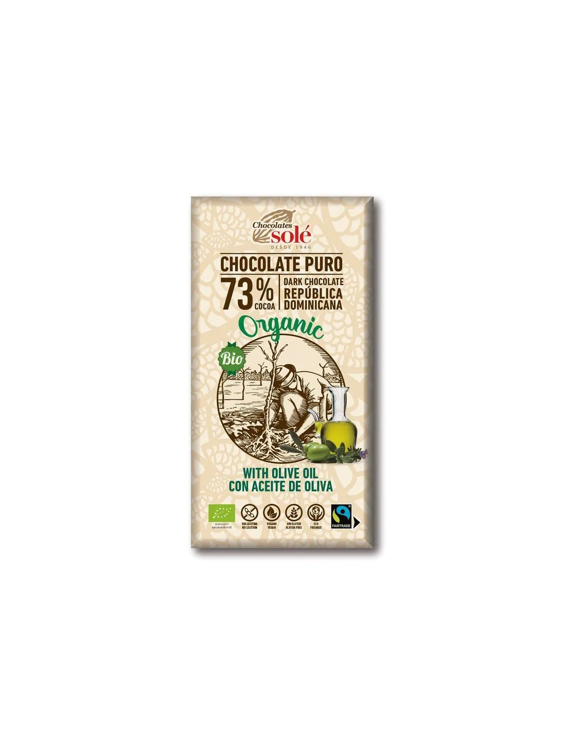 Шоколади Solé - 73% органичен шоколад със зехтин. Свеж полъх на Средиземноморието. Това е шоколад с екстра върджин зехтин.