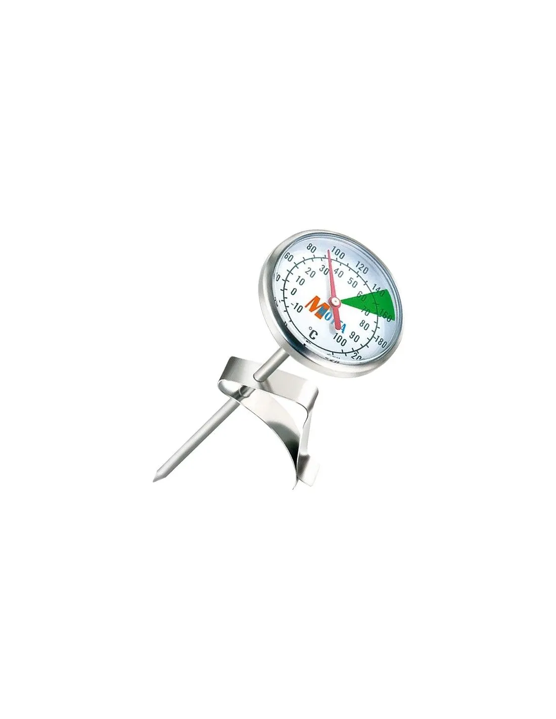 Професионалният аналогов термометър за мляко на италианската металургична компания Motta е основен инструмент за всички баристи. Благодарение на практичната закопчалка той се държи много добре върху вашето лате.