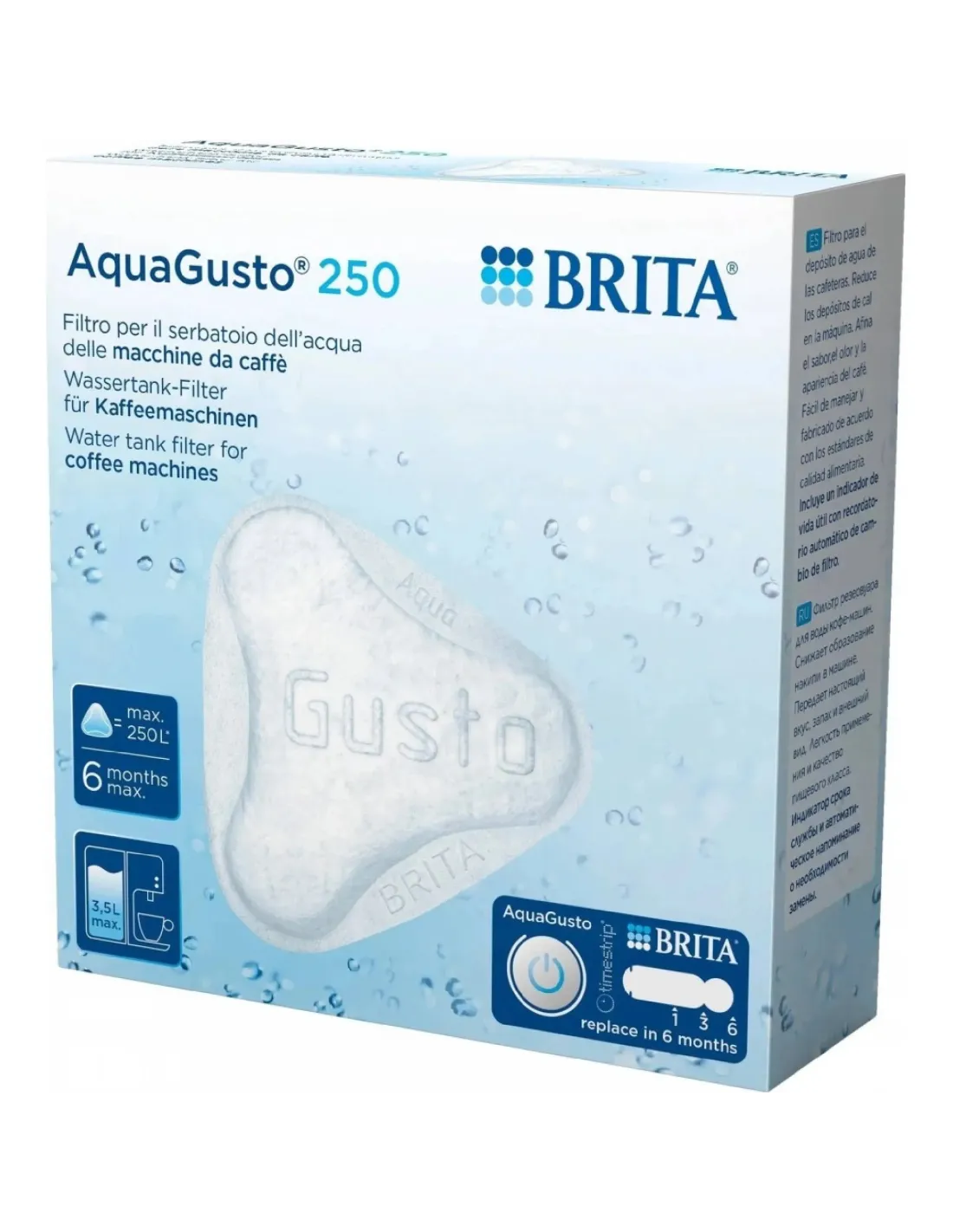 Редовната употреба на филтъра Brita AquaGusto 250 допринася за по-доброто качество на напитките, намалява натрупването на котлен камък и свежда до минимум необходимостта от често отстраняване на котлен камък в кафемашината. Той е съвместим с повечето налични в търговската мрежа домашни кафемашини с резервоар за вода.