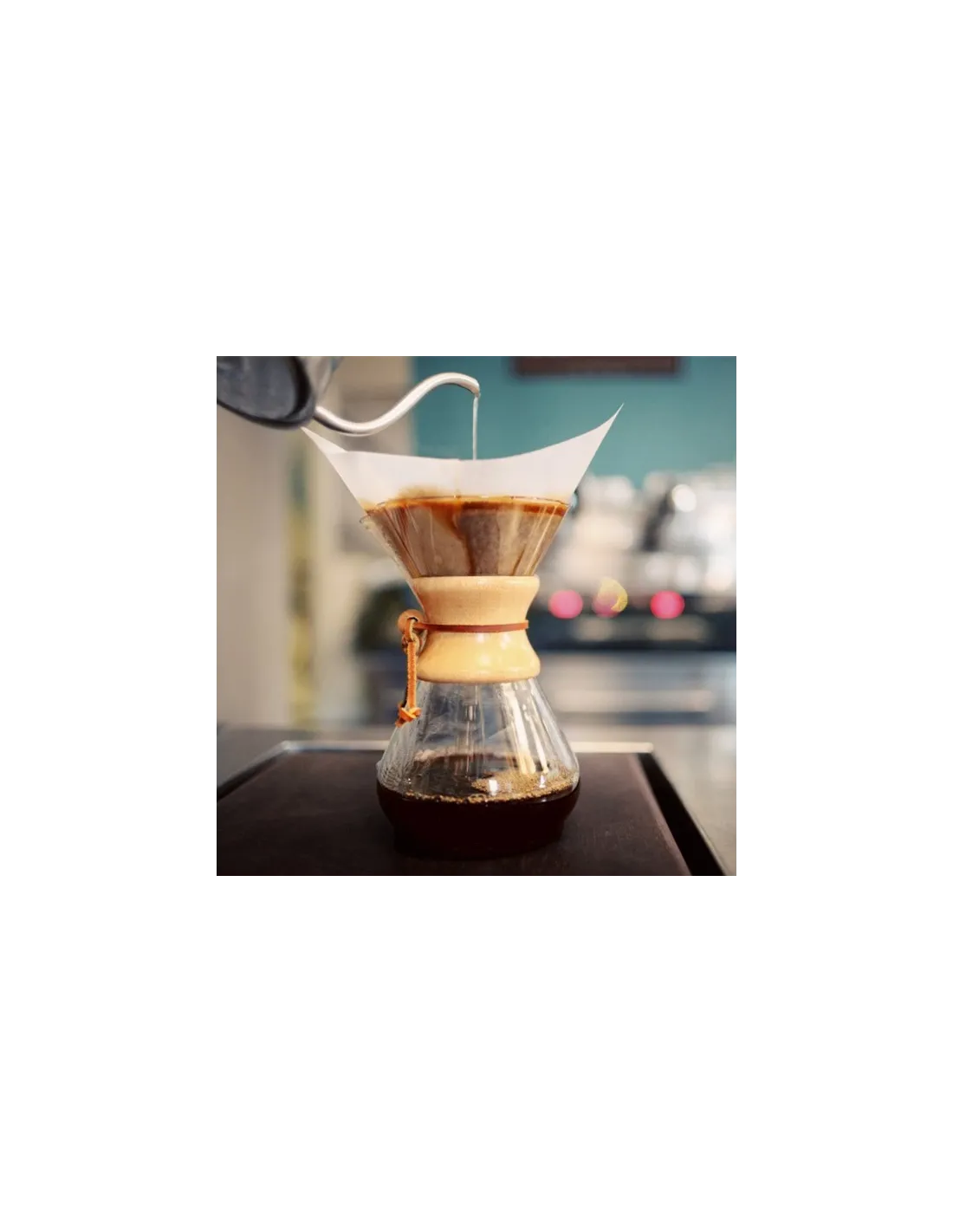 Chemex, na první pohled připomínající karafu na vodu, je vyroben z borosilikátového skla a uprostřed má dřevěný korzet uvázaný pomocí kožené pásky.