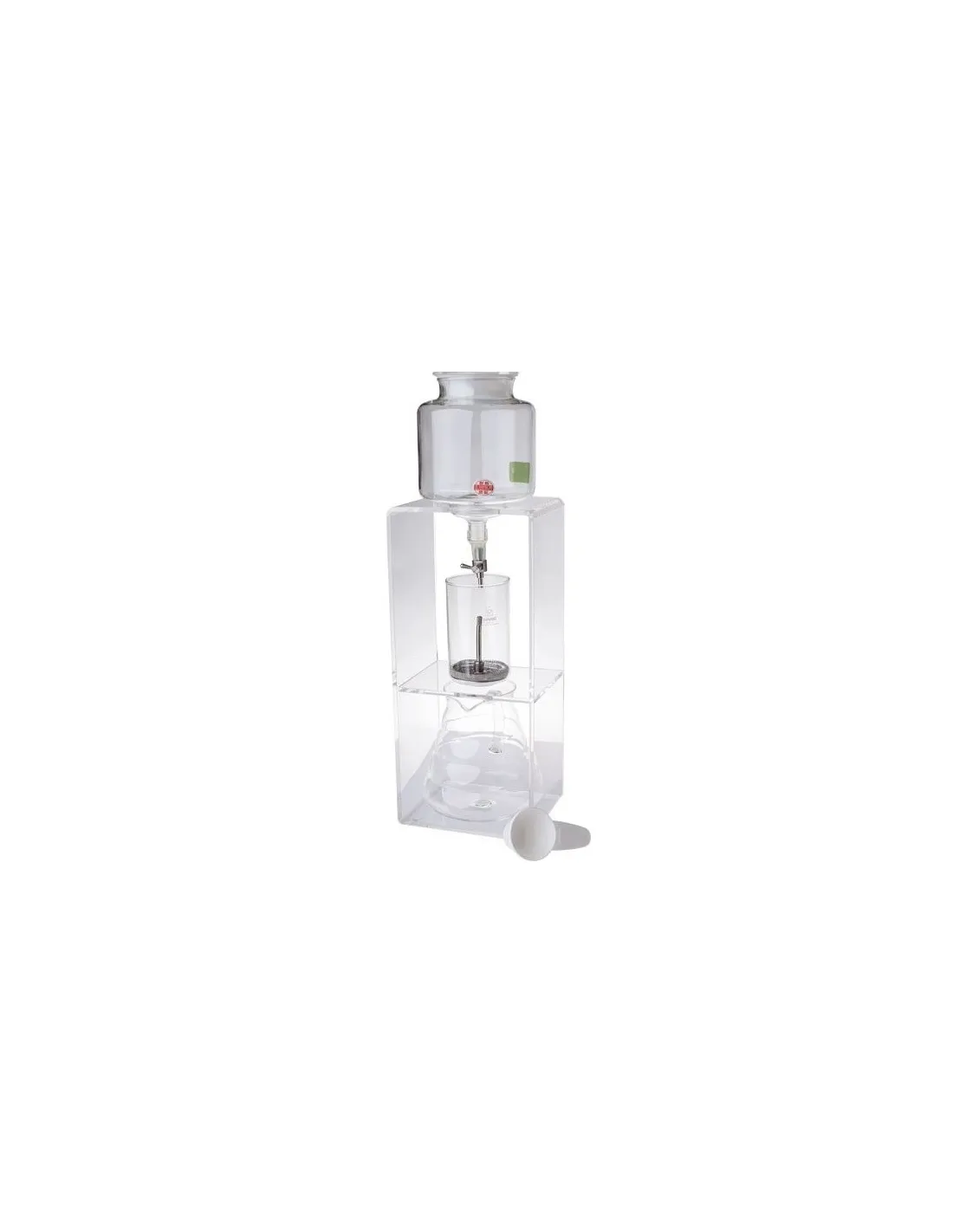 V horní nádobě je studená voda, která přes nerezový filtr pomalu prokapává skrz kávu do spodní servírovací konvičky. Díky kovovému ventilu snadno nastavíte rychlost protékání vody. Filtrace zabere i několik hodin, záleží na nastavení ventilu a Vaší chuti. Ideální je nastavit rychlost protékání 1 kapka za vteřinu. Plná nádoba je potom přefilrována přibližně za 5 hodin. Experimentovat můžete i s hrubostí kávy, kterou zvolíte.