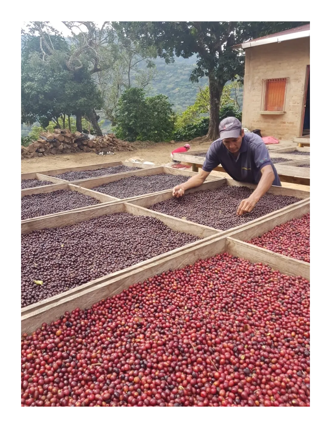 Třešně se sbírají ručně. Po sklizni se uloží do uzavíratelných nádob a nechají se anaerobně zkvasit. Poté se třešně vyloží na terase a nechají se 14 až 20 dní sušit. Prvních několik dní se suší 20-30 minut. Během procesu sušení se třešně prohrabují, aby sušení bylo rovnoměrné. Usušené třešně poté odpočívají a jsou převezeny do sušárny Beneficio El Carmen v Conception de Ataco v Ahuachapapnu. Káva pak před vývozem odpočívá 60-150 dní.
