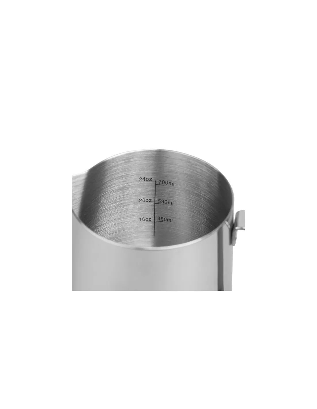 Na vnitřní stěně konvičky jsou po obou stranách vyznačeny rysky měřící objem a to v mililitrech a uncích. Díky tomu máte možnost odměřit přesně takové množství mléka, jaké potřebuje a předejdete tak zbytečnému plýtvání. Rysky měří do 700 ml a tak Vám zbude dostatek místa pro napěnění mléka a dosažení co nejlepší textury.