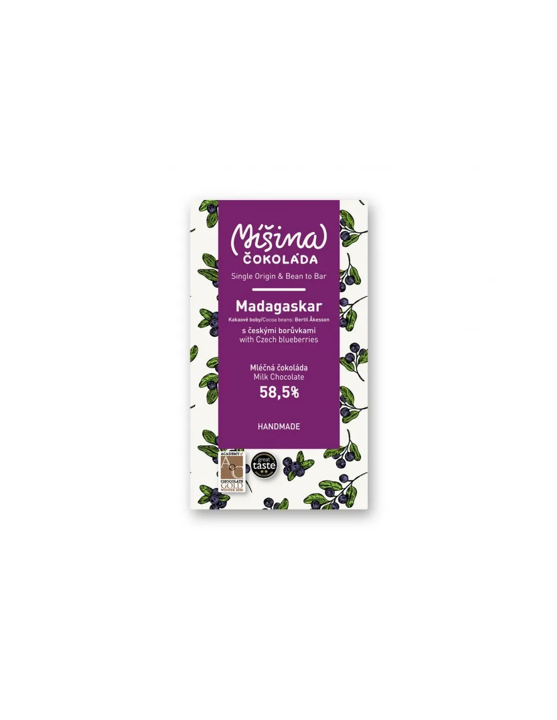 Mléčná čokoláda z organických kakaových bobů z Madagaskaru. Tyto boby chutnají po ovoci a přidali k ním ještě borůvky z českých lesů.