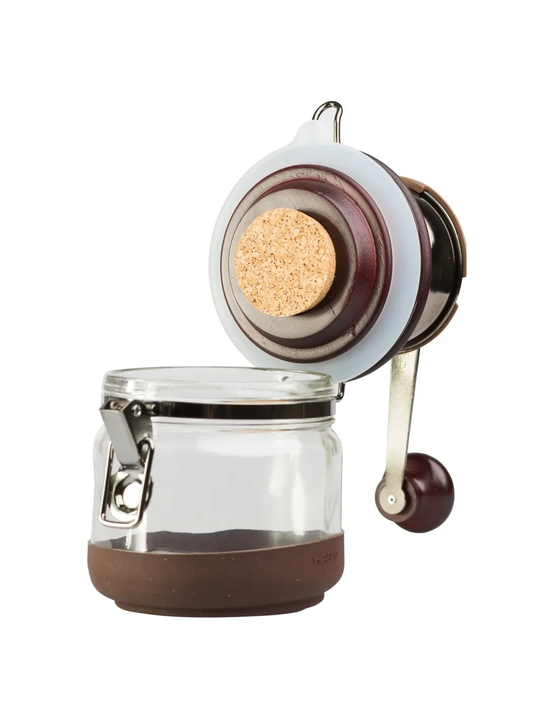Nejnovější verze ručního mlýnku Hario Canister (CMHN-4) s keramickými mlecími kameny, nastavitelnou hrubostí mletí a velkou těsněnou nádobou pro uchování čerstvě namleté kávy.