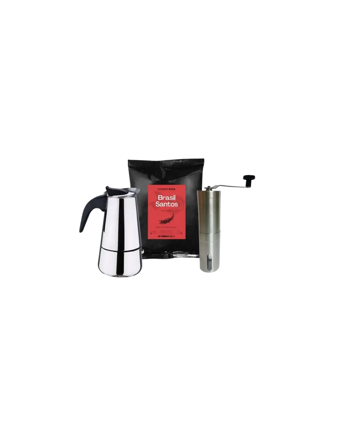 Čerstvá káva Brazílie Santos 250g, moka konvice Kaffia 6 šálků z nerezu a mlýnku na kávu Kaffia Tall. Tento set vám vykouzlí silnou kávu italského stylu podobnou espresso.