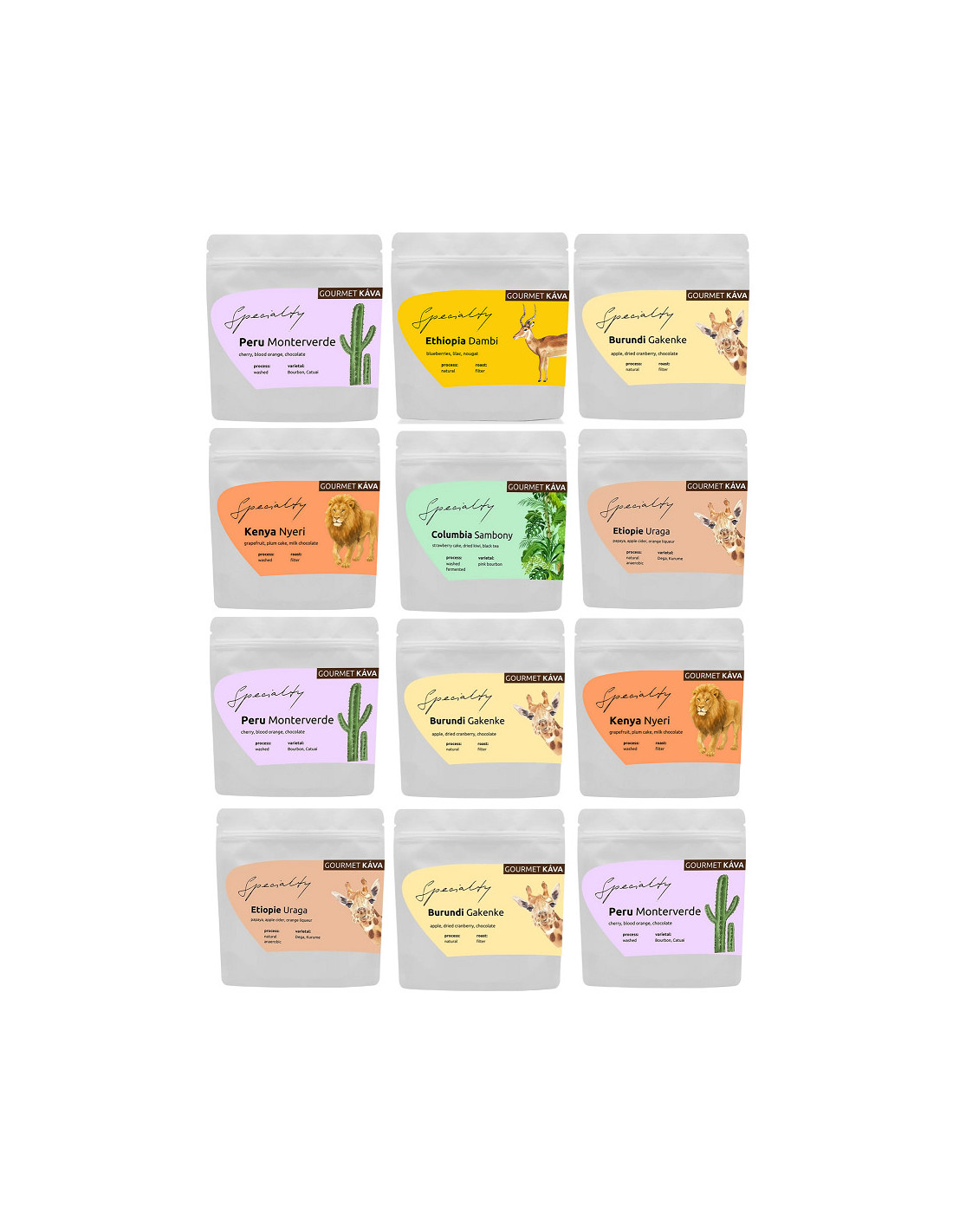 - 3x Peru Monterverde 250g, 3x Burundi Gakenke 250g a 1x 2Etiopie Dambi Natural 250g, 2x 250g Etiopie Uraga, 1x Kolumbie D. Sambony, 2xKenya Nyeri 250g
