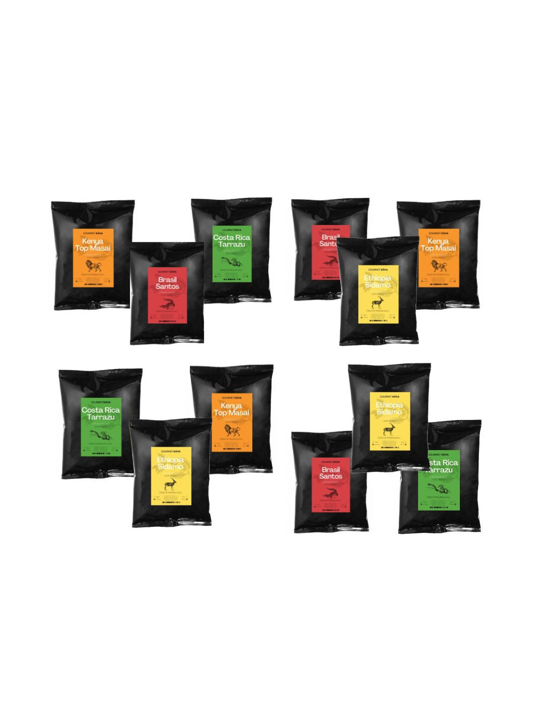 - 3x 250g Brazil Santos medium roast, 3x 250g Ethiopia Sidamo medium roast, 3x 250g Costa Rica Tarazzu medium roast, and 3x 250g Kenya Top Masai medium roast
