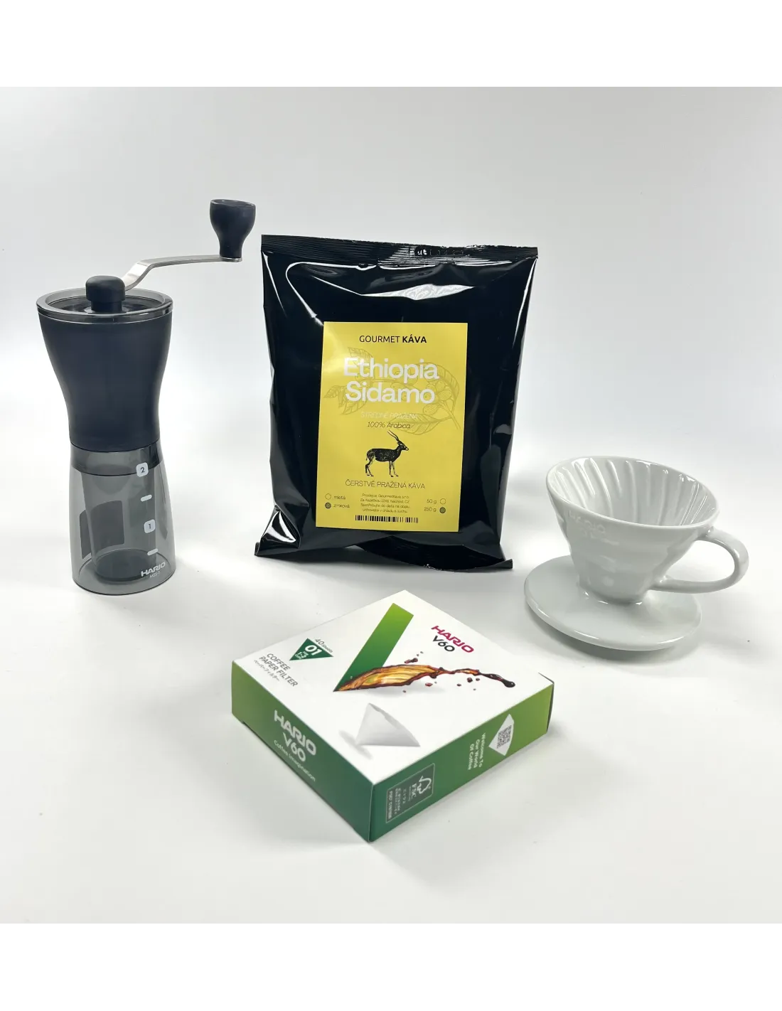 Fresh coffee Ethiopia Sidamo – medium roast 250g, Hario Mini Mill Slim Plus grinder and Hario V60-01 ceramic dripper with filters as a complete professional set for brewing perfect filtered coffee.