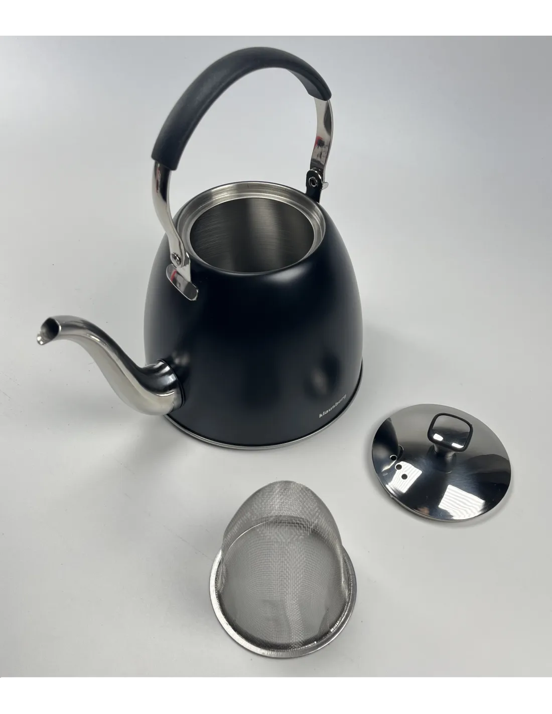Klausberg Gooseneck stainless steelteapot with elegant design and removable strainer, ideal for making tea and herbal infusions.