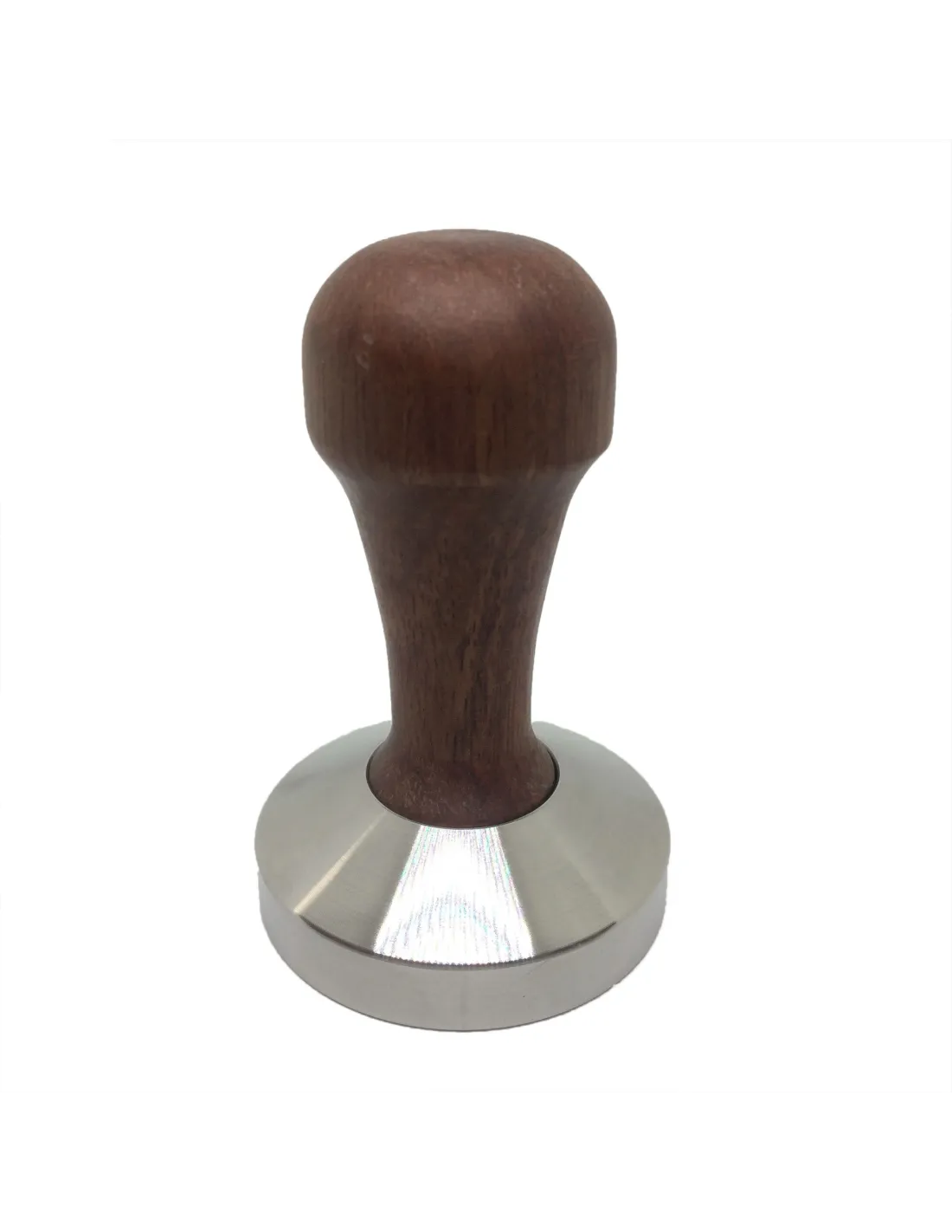 Theprofessional tamper flat has a flat metal base and an ergonomic wooden handle and its weight is 370g.