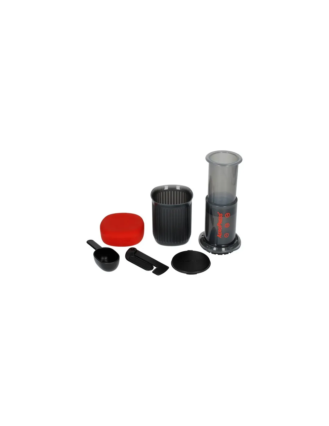 Set sadrži: Aeropress, 50 papirnatih filtera, miješalicu, mjericu, držač za filtre (za 20 filtera), šalicu i poklopac.