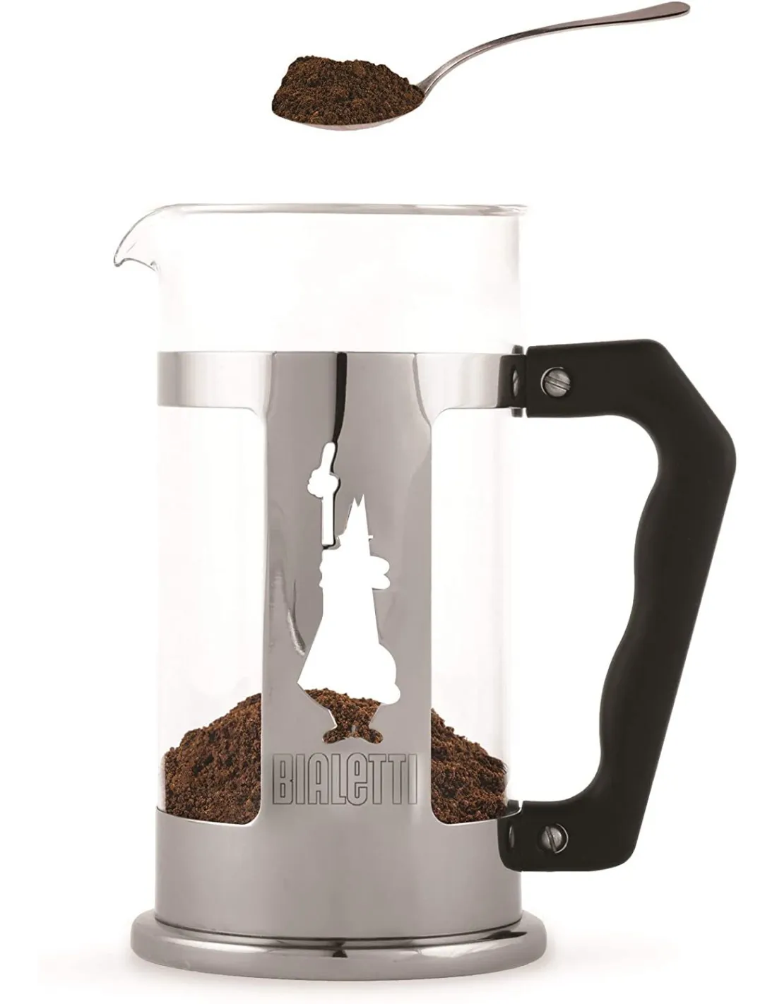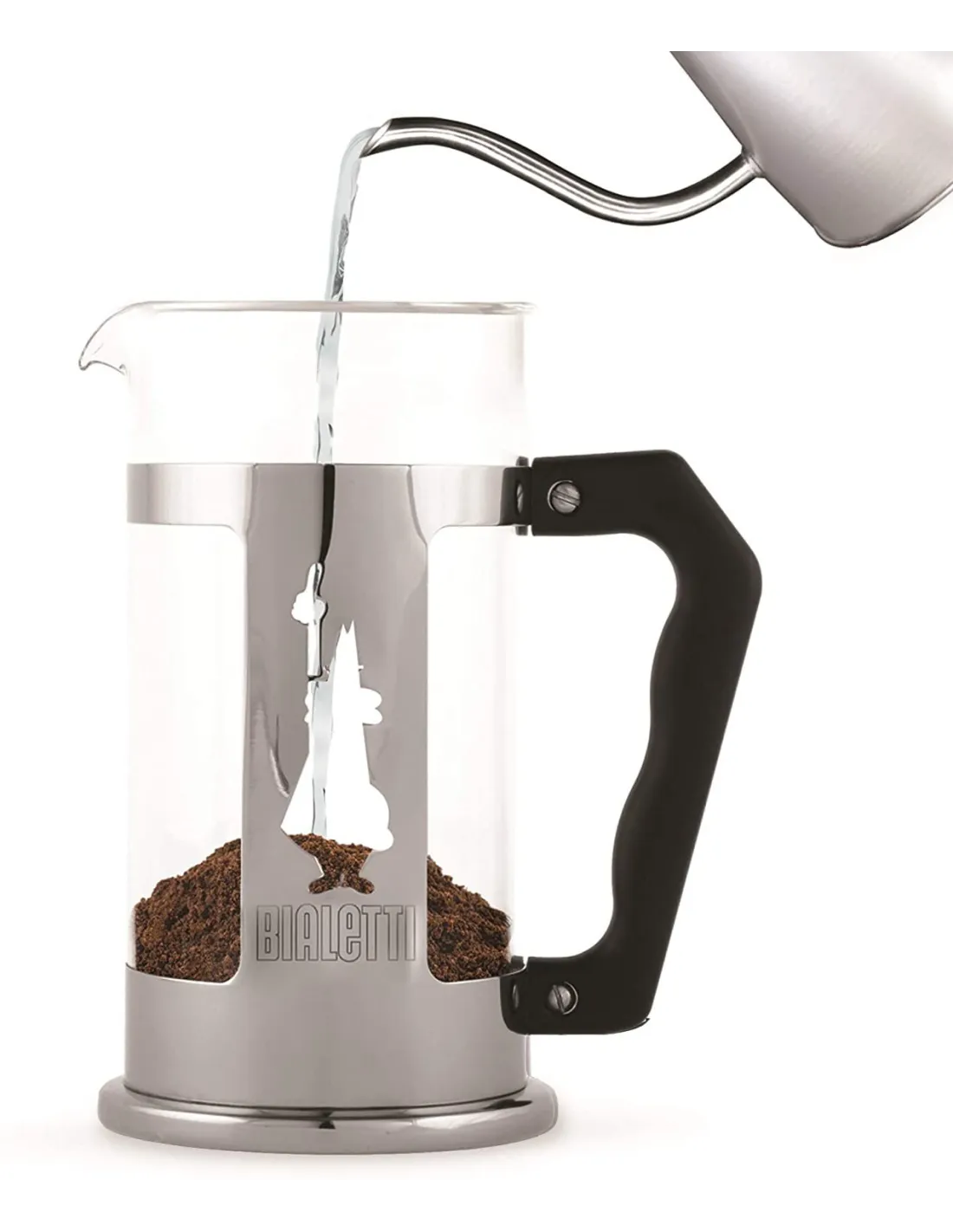 Bialetti luxus rozsdamentes acélból készült, 350 ml űrtartalmú francia presszó a friss kávé egyszerű elkészítéséhez. Egy Bialetti bábu képével.