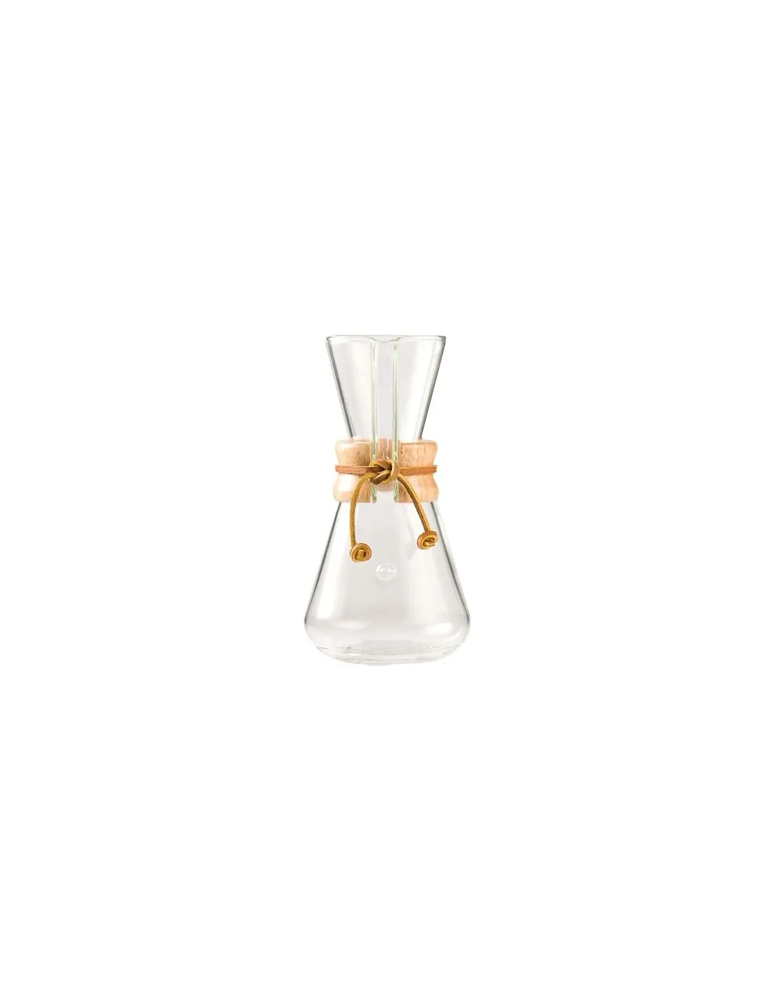 AChemex, amely első pillantásra egy vízkaraffára hasonlít, boroszilikát üvegből készült, és középen egy fából készült fűzőt tartalmaz, amelyet egy bőrszíj tart a helyén.