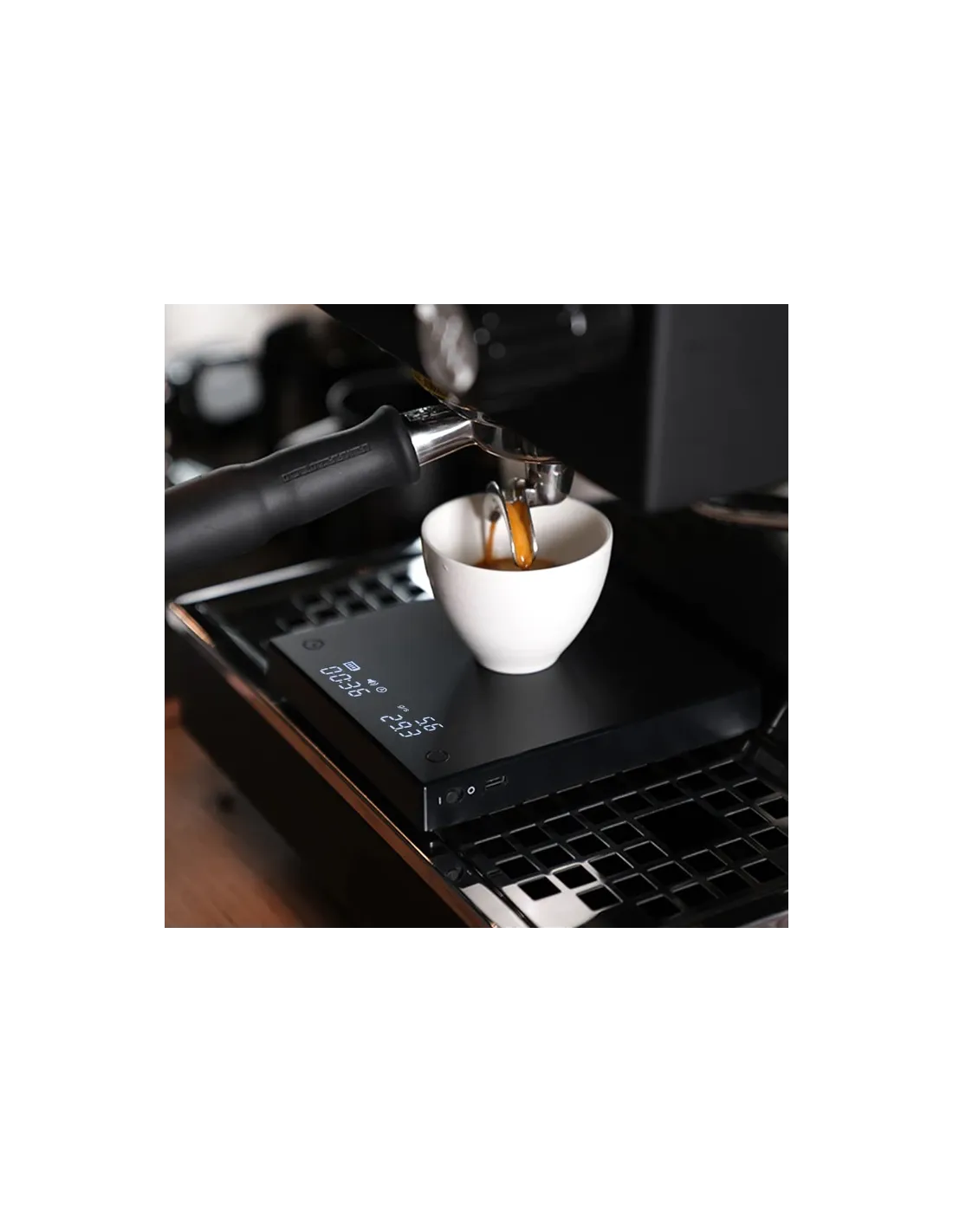 A mérlegen lévő tároló stabilitását vízálló, gumiborítású alátét segíti, amely a karcolások elleni védelmet is növeli. Méretei miatt könnyen elfér a legtöbb eszpresszógép portaszűrője alatt.