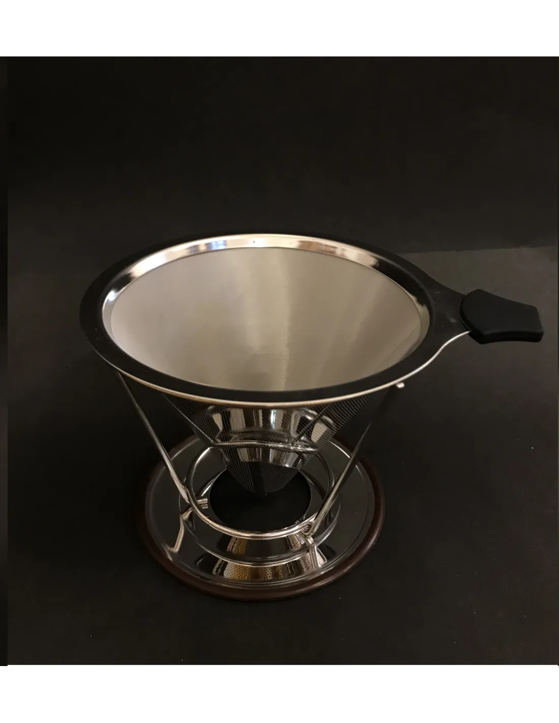 A csepegtető fémszűrőből áll vastag szitával és műanyag fogantyúval a tetején és egy fém állvány. Maga a fémszűrő ezért kávéfőzés közben felemelhető/megfogható a kézben, vagy az állványon hagyható, amely a szűrőt klasszikus csepegtetővé alakítja. Köszönöm ez a design a címen elkerülheti, hogy állandóan papírszűrőket kelljen vásárolniaamely mindkettő sokkal gazdaságosabb és környezetbarátabb megoldás is..