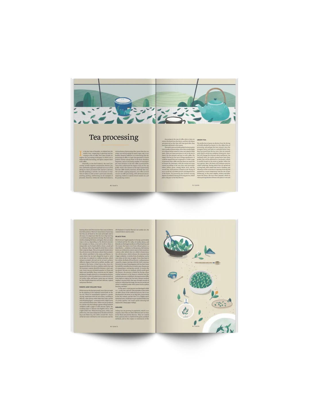 A"Kávé" fejezetben folytatjuk a kávét és a teát összehasonlító sorozatunkat - ezúttal a feldolgozási módszereket vesszük közelebbről szemügyre, majd egy cikk következik arról, hogy a teaszertartás mely elemei alkalmazhatók a kávéra. Innen a távoli Guatemalába utazunk, egy több mint 300 mikroklímából álló országba, és megvizsgáljuk, hogy ez hogyan befolyásolja a kávétermelést. A fejezetet a jelenlegi árválságról és az ahhoz vezető okokról szóló terjedelmes esszével zárjuk.