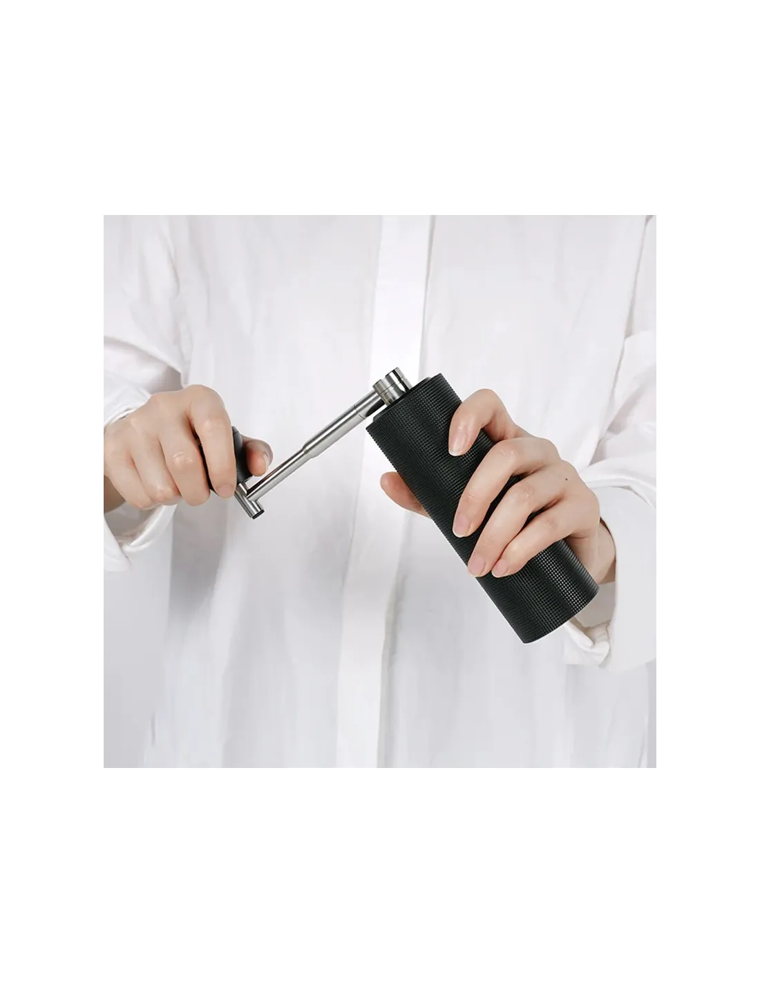 Atexturált felület biztosítja, hogy az őrlő ne essen ki a kezéből, és az őrlés kényelmes legyen. A mindössze kb. 5 cm átmérőjű, kb. 16 cm-es magasságú, fogantyúval együtt kb. 16 cm magas és könnyű Timemore daráló minden utazó elvárásának megfelel. A fogantyú hatszögletű vége biztosítja a kényelmes őrlést és az összecsukható fogantyú egyszerű alkalmazását.