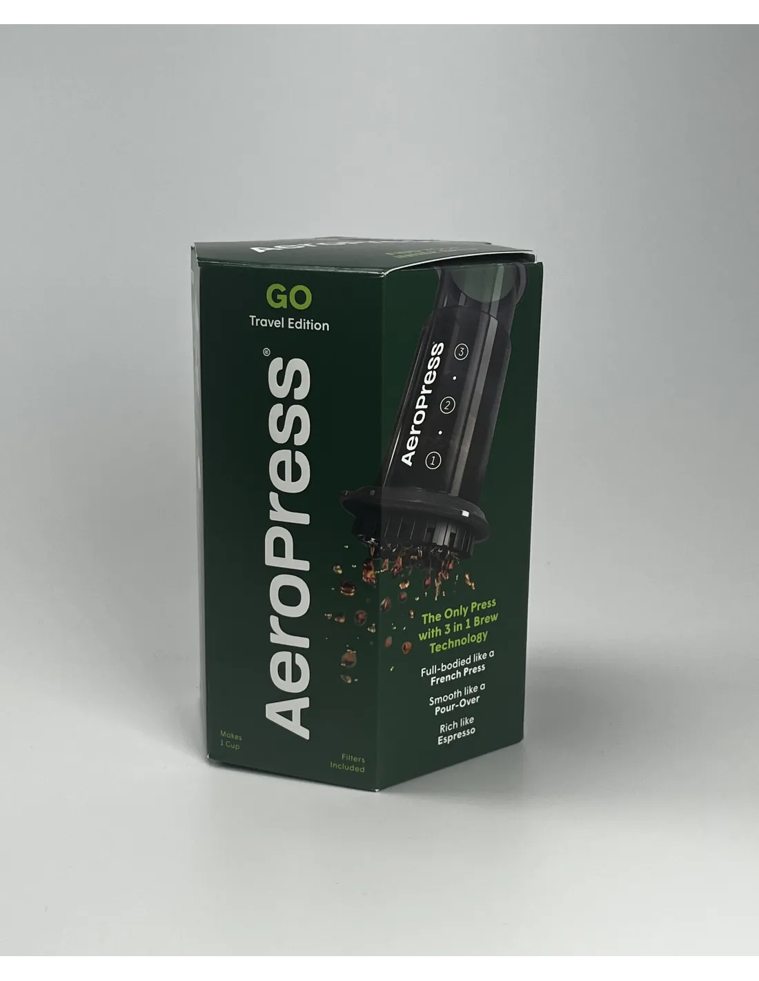 Aeropress GO to nowa wersja klasycznego Aeropressu, jest nieco mniejsza niż oryginalny Aeropress i zawiera kubek (i kilka innych drobiazgów patrz poniżej), który można zapakować do Aeropressu i z którego można również pić przygotowaną kawę. Opakowanie zawiera również 50 filtrów, które są takie same jak w poprzedniej wersji. Aeropress to świetne urządzenie, które łączy w sobie zalety francuskiej prasy, kawy filtrowanej i tradycyjnego ekspresu do kawy. Wielu miłośników kawy zakochało się w Aeropressie również dlatego, że pozwala on odkrywać nieograniczone smaki kawy poprzez eksperymentowanie z czasem parzenia, temperaturą wody i drobnością/zgrubnością mielenia.