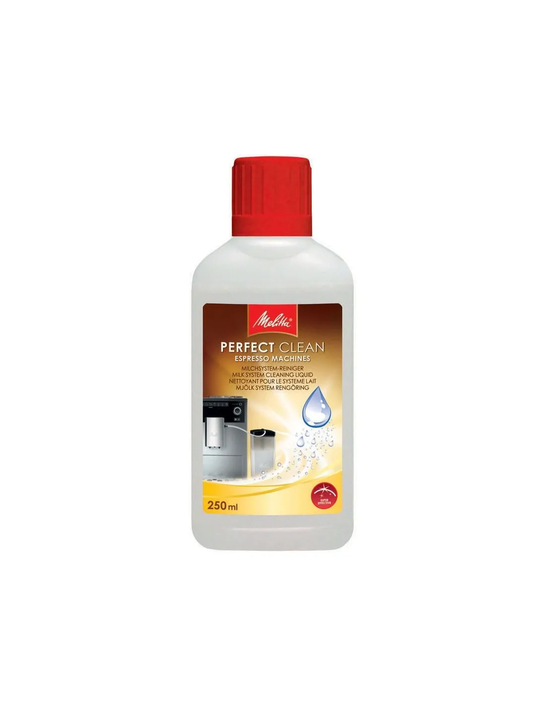 Melitta® PERFECT CLEAN to płynny środek czyszczący, który dokładnie, ale delikatnie czyści w pełni automatyczne ekspresy do kawy z pozostałości mleka. Dzięki temu ekspres do kawy znów będzie higienicznie czysty.