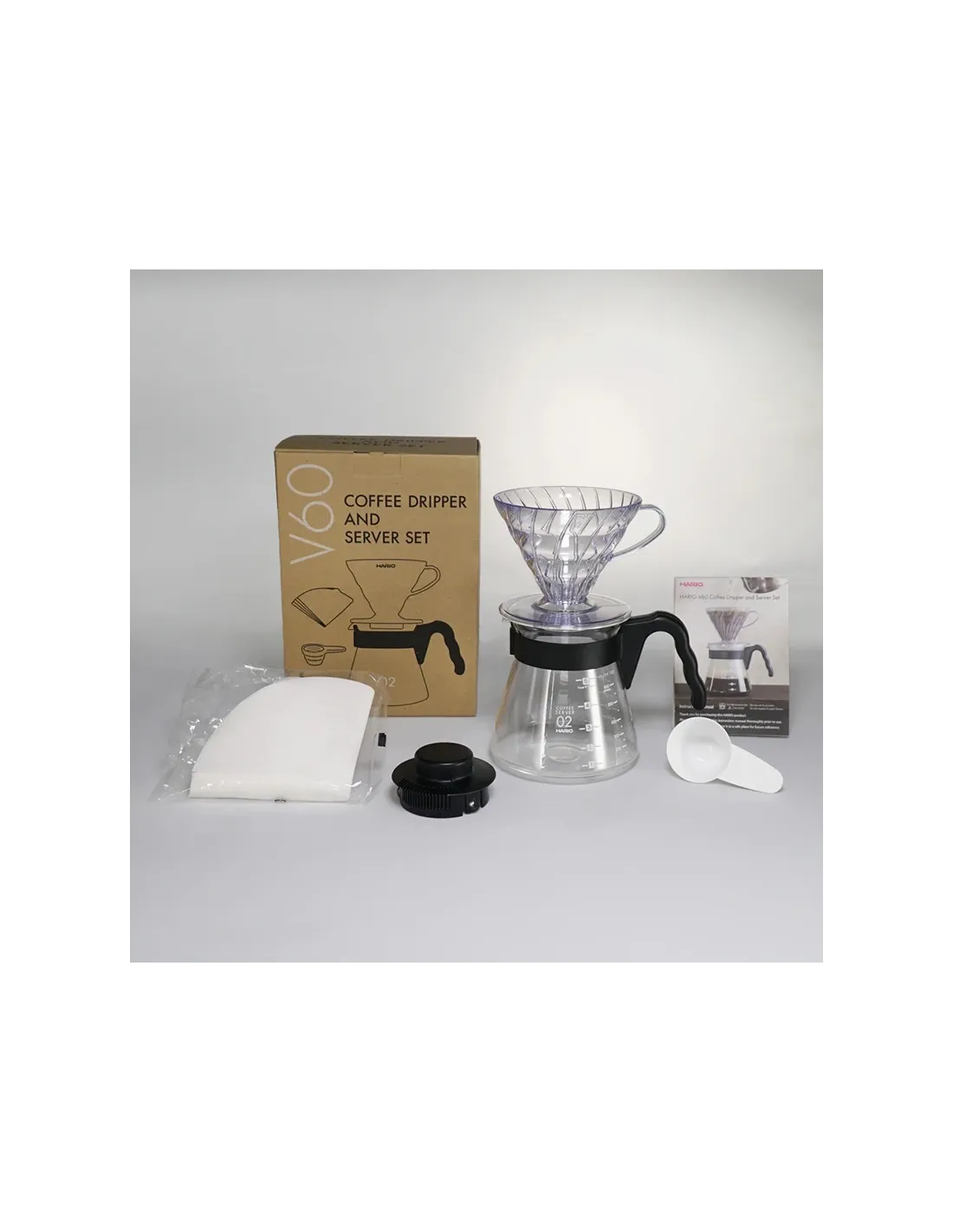 Zestaw zawiera plastikowy dripper Hario V60-02 do przygotowania 1-4 filiżanek, szklany czajniczek Hario z plastikowym uchwytem i pokrywką o pojemności 600 ml, 40 białych papierowych filtrów i plastikową miarkę do kawy. Po prostu wszystko ładnie połączone w najwyższej jakości Hario.