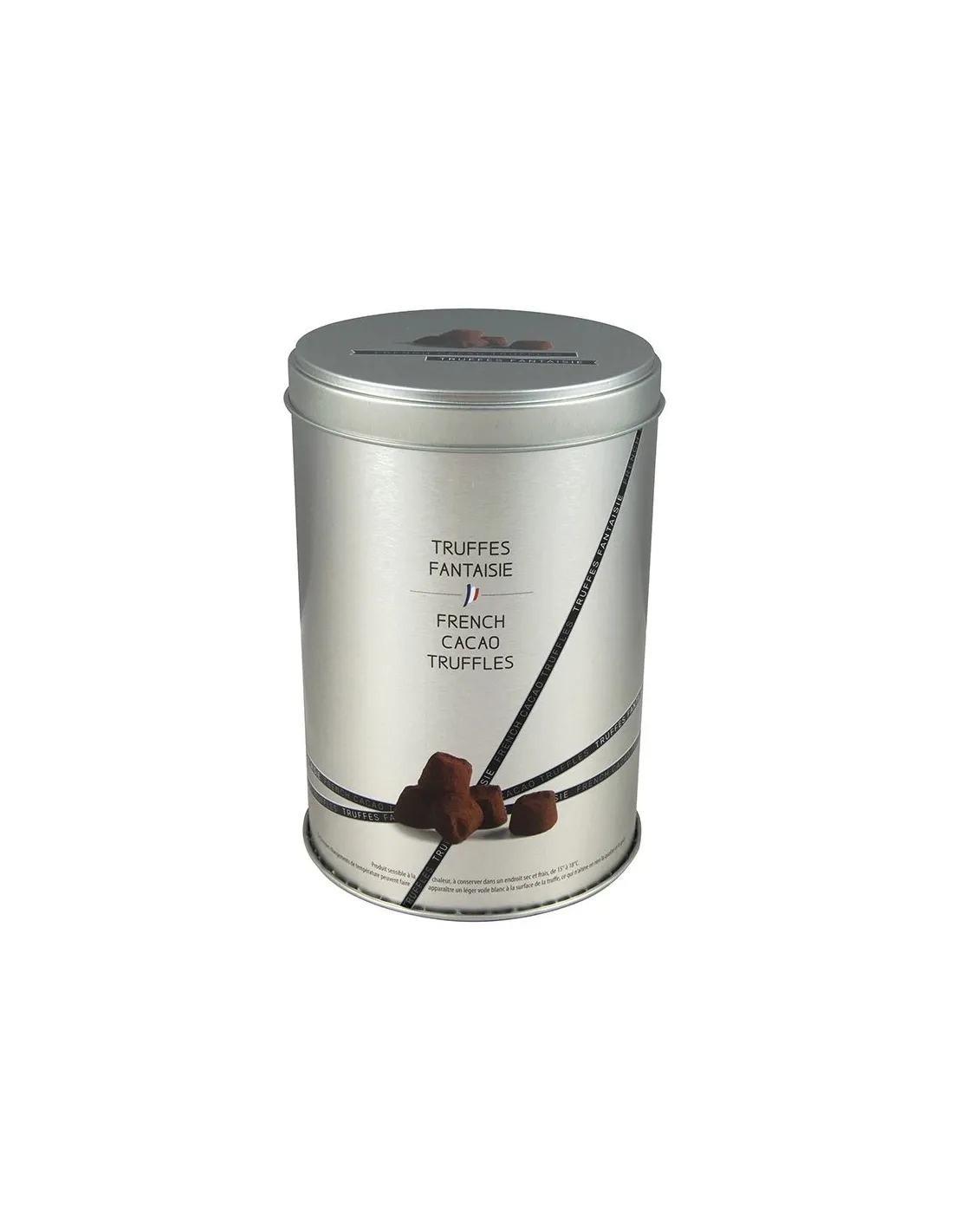 Delikatne trufle kakaowe Mathez Fantaisie z solonym karmelem w eleganckiej srebrnej puszce. Doskonałe do kawy lub po prostu dla przyjemności.