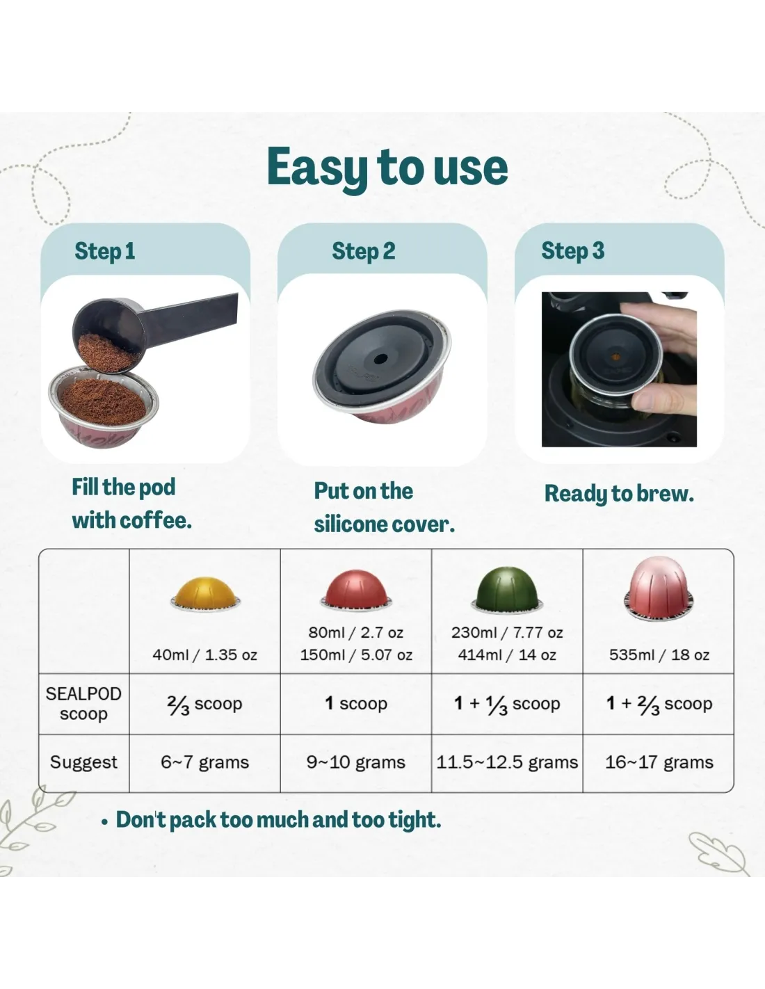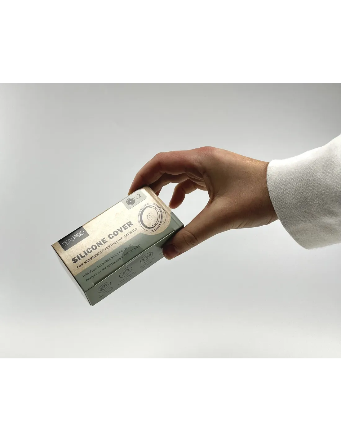 Silikonowe nasadki wielokrotnego użytku Sealpod są przeznaczone do ekspresów do kawy Nespresso VertuoLine® i Vertuo®. Dzięki tym nasadkom można ponownie wykorzystać wyczyszczone jednorazowe kapsułki Nespresso Vertuo®.