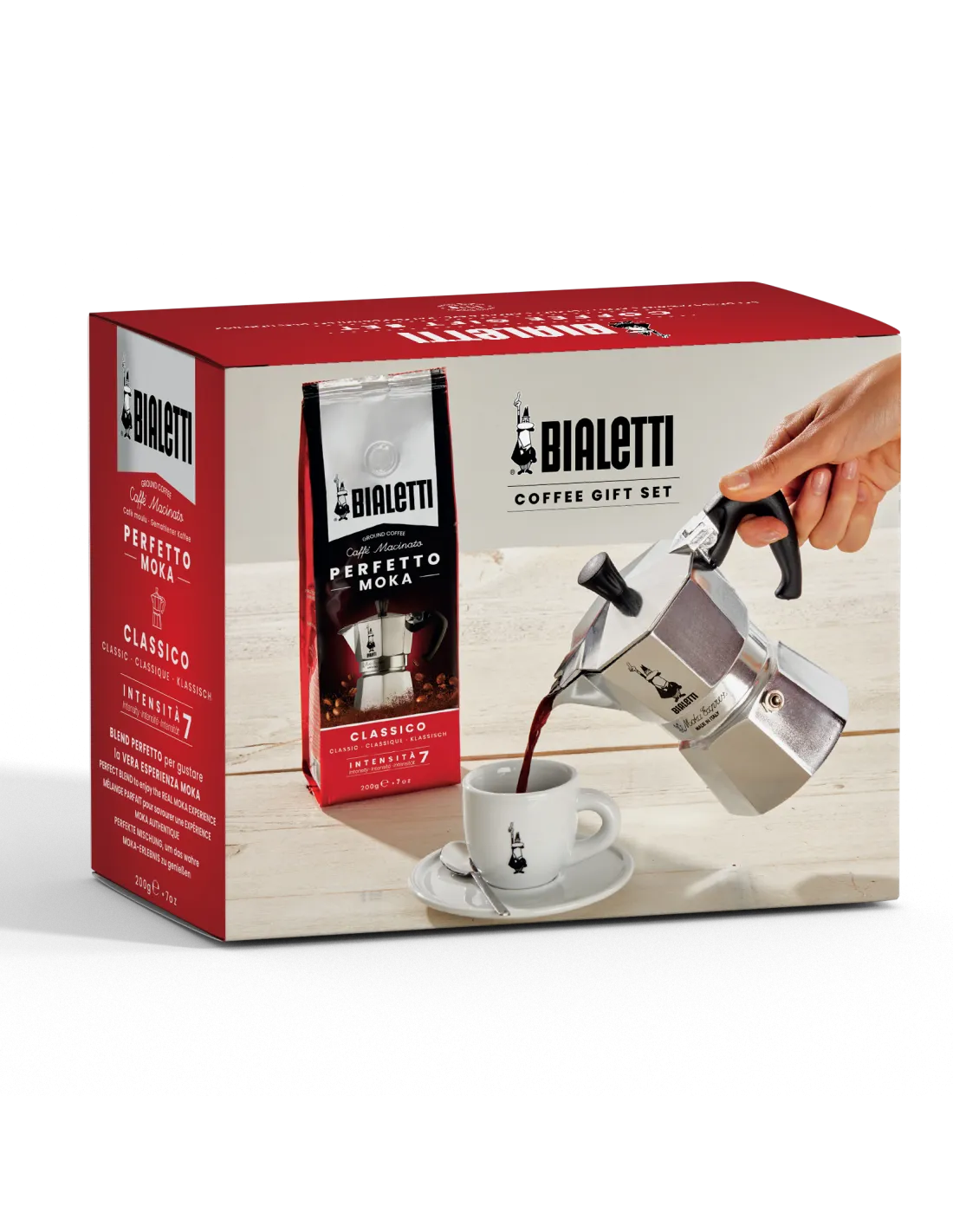 Legendarna kawiarka Moka Express włoskiej firmy Bialetti do tradycyjnego przygotowywania mocniejszej kawy. Wystarcza na 6 filiżanek, tj. ok. 270 ml. Prezent zapakowany z kawą Bialettii 200g.