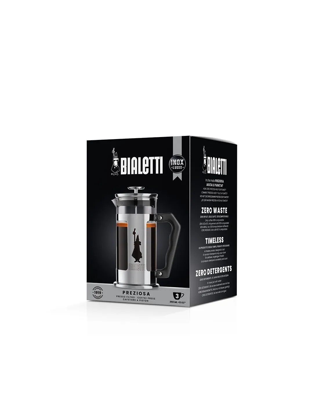 Luksusowy zaparzacz Bialetti ze stali nierdzewnej o pojemności 350 ml do łatwego przygotowywania świeżej kawy. Ze zdjęciem manekina Bialetti.