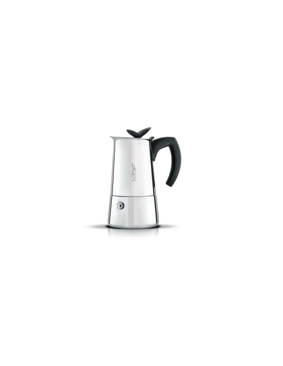 Oală elegantă de moca Bialetti Musa Restylingcomplet inoxidabil de la compania italiană Bialetti pentru prepararea tradițională a 2 cești de cafea mai tare (aprox. 75 ml). Nu este potrivit pentru inducție.
