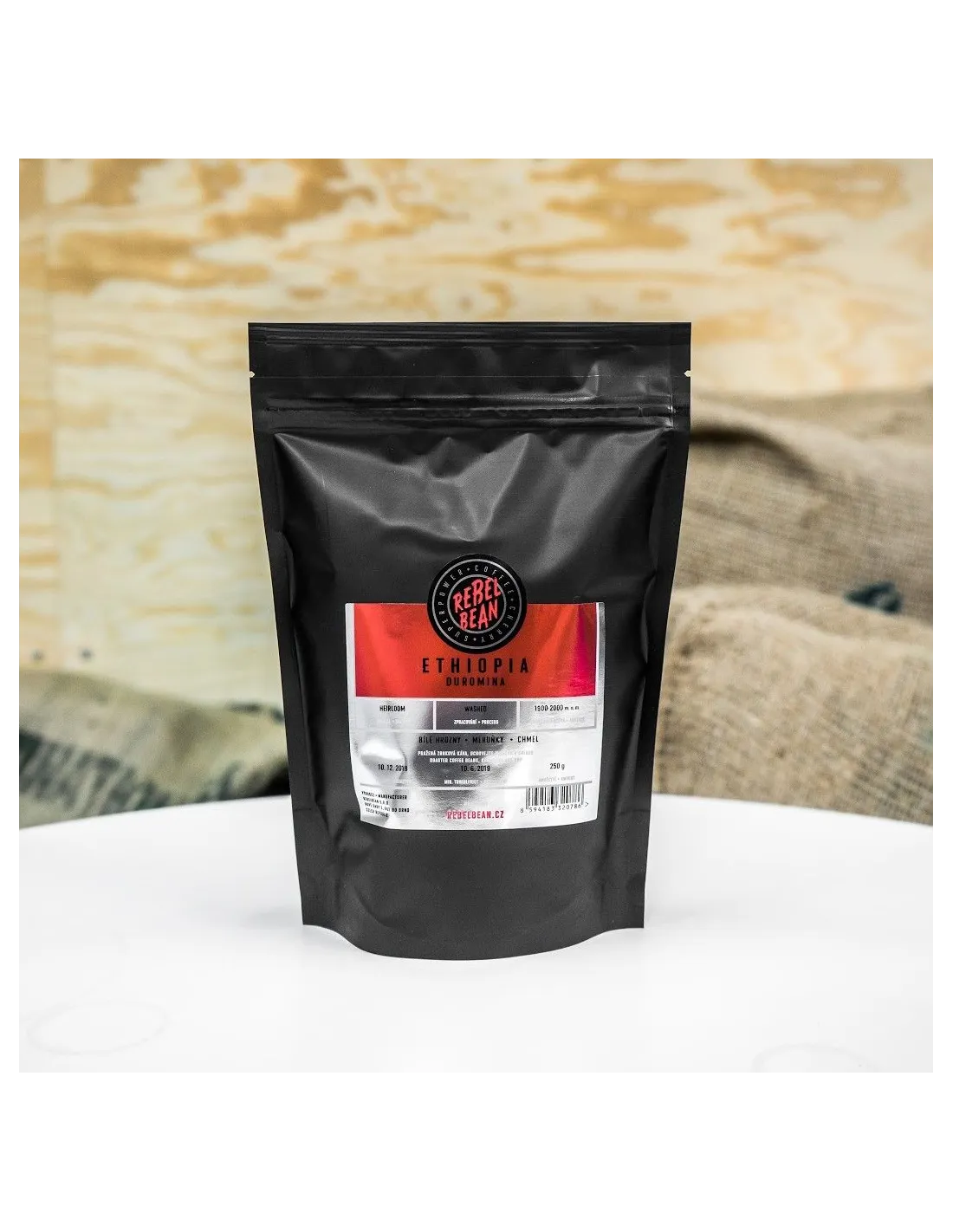 Selecție excepțională și cafea Duromina din Etiopia proaspăt prăjită de la prăjitoria Rebelbean din Brno. Origine transparentă. Recolta actuală. Întotdeauna proaspăt prăjite.
