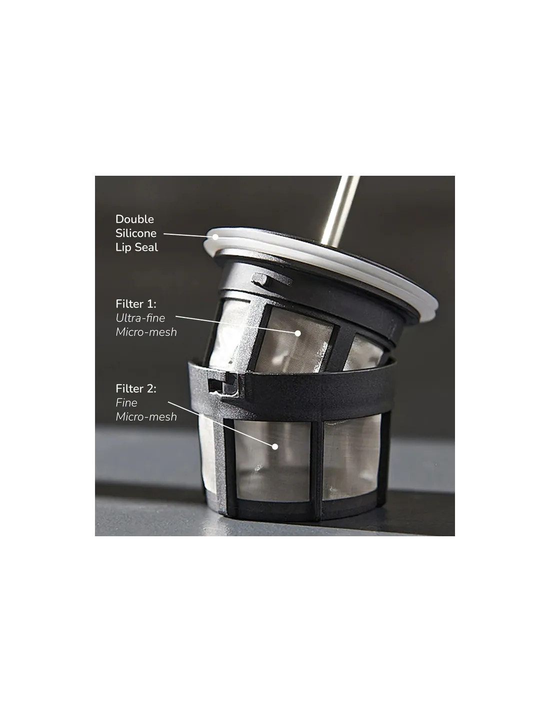 A doua inovație este modul în care este comprimat filtrul în sine, care , odată ce pistonul este apăsat complet până la fund, împiedică continuarea extracției, adică infiltrarea cafelei levigate înapoi în băutură . Spațiul tampon dintre cele două filtre separă în siguranță cafeaua extrasă.