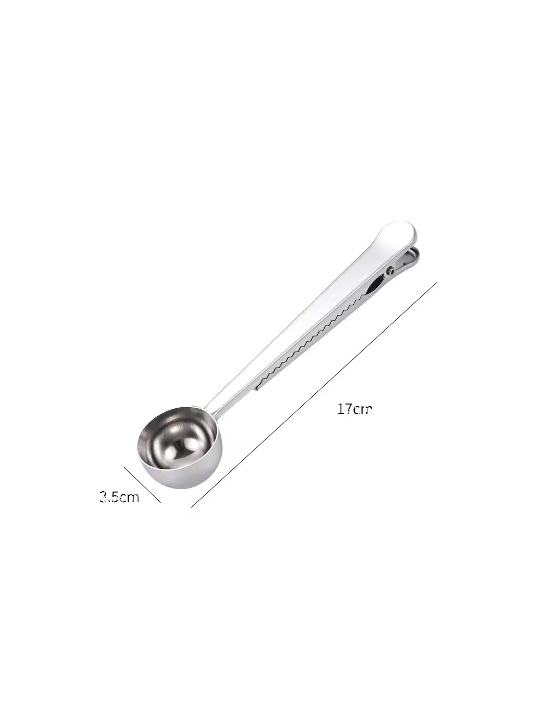 Praktična merilna skodelica iz nerjavečega jekla z vgrajeno sponko za natančno odmerjanje kave in enostavno zapiranje odprtega paketa.