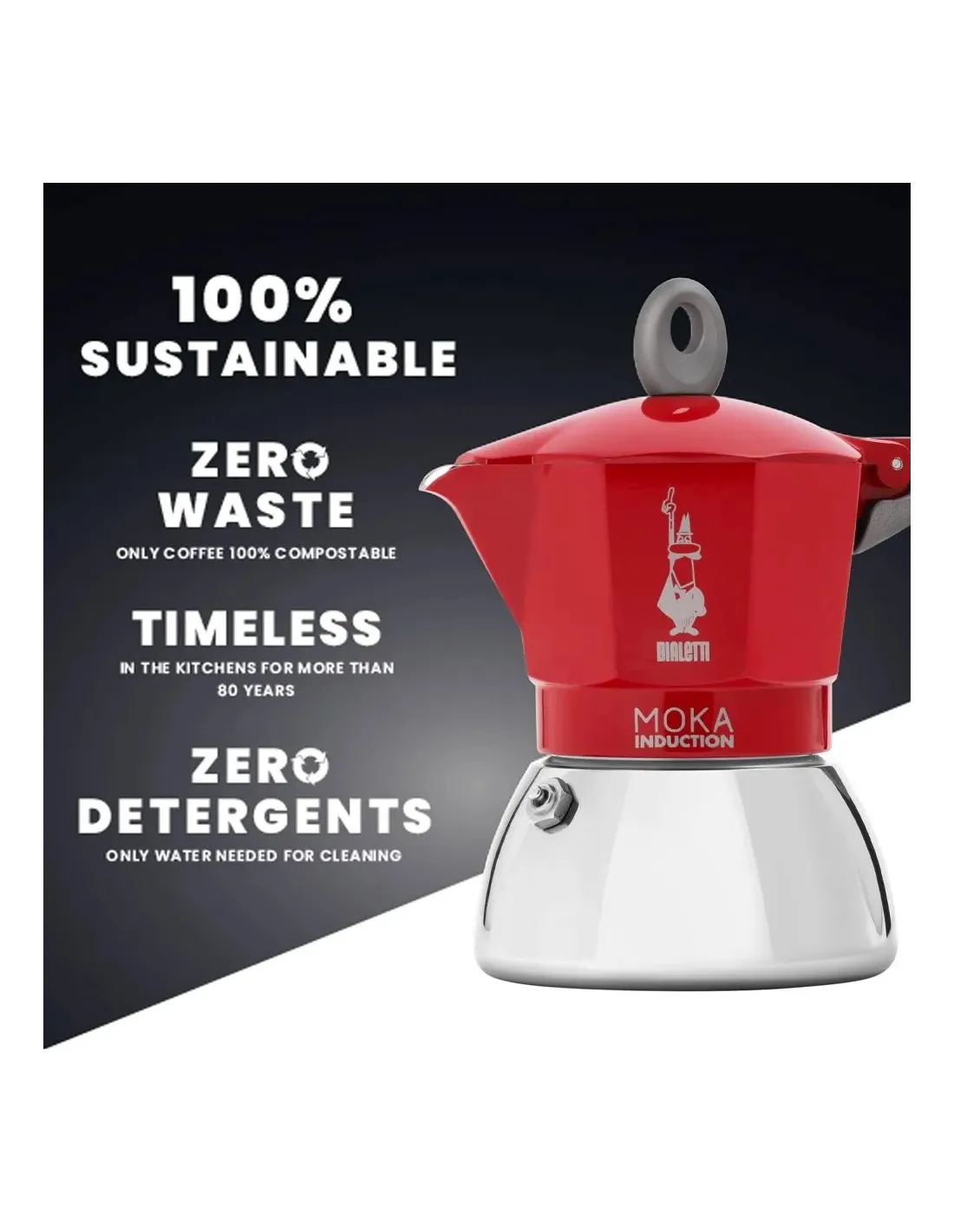 Spodnja posoda aparata Bialetti Moka Induction je izdelana iz poliranega nerjavečega jekla. Zgornja posoda je izdelana iz aluminija, primernega za živila. Udoben ročaj je izdelan iz toplotno odporne plastike. Prav zaradi kakovostne, robustne in hkrati preproste konstrukcije so bialetke tako priljubljene po vsem svetu.
