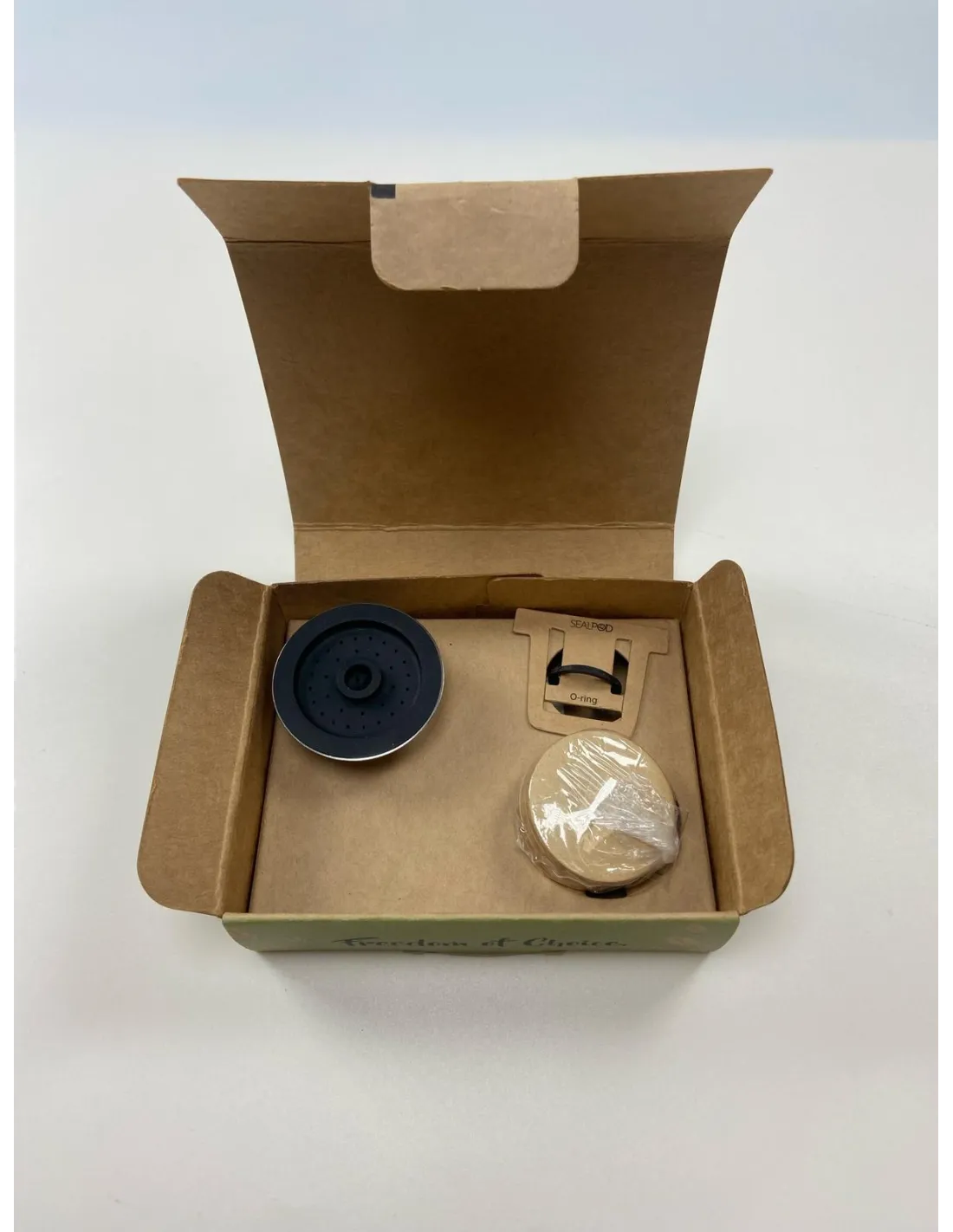 Vsako pakiranje vsebuje: 1x kapsula Sealpod iz nerjavečega jekla, 100x papirnati filter