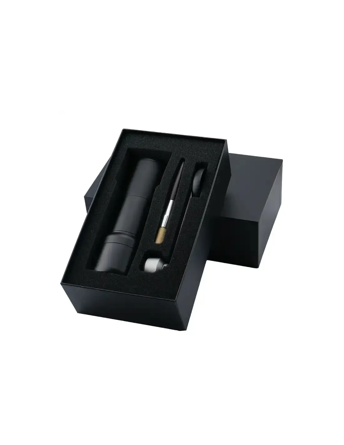 Súčasťou balenia je drevená kefka na čistenie mlynčeka a nabíjací kábel USB-C, látkové vrecko, návod, krabica.