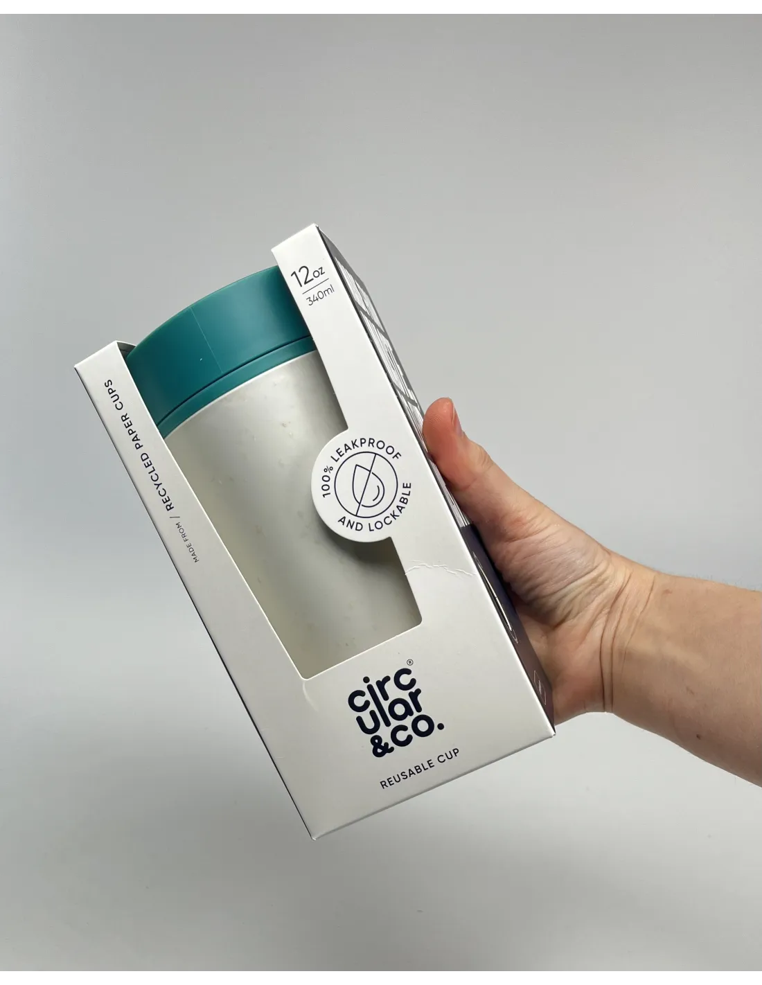Štýlový pohár rcup vyrobený z recyklovaných materiálov, praktický a pohodlný na používanie. Elegantná farebná kombinácia kriedy a akvamarínu pre udržateľný a moderný dizajn.