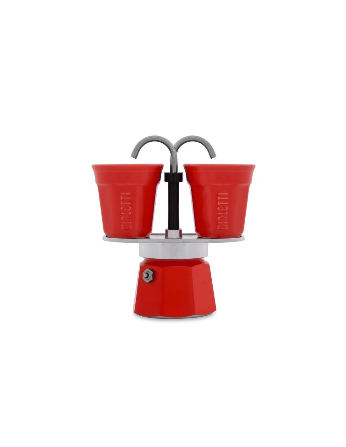 Inovatívny a atypický moka kanvička Bialetti Mini Express pripraví 2 šálky kávy naraz. Na rozdiel od klasických moka kanvíc káva tečie priamo do pripravených červených šálok.