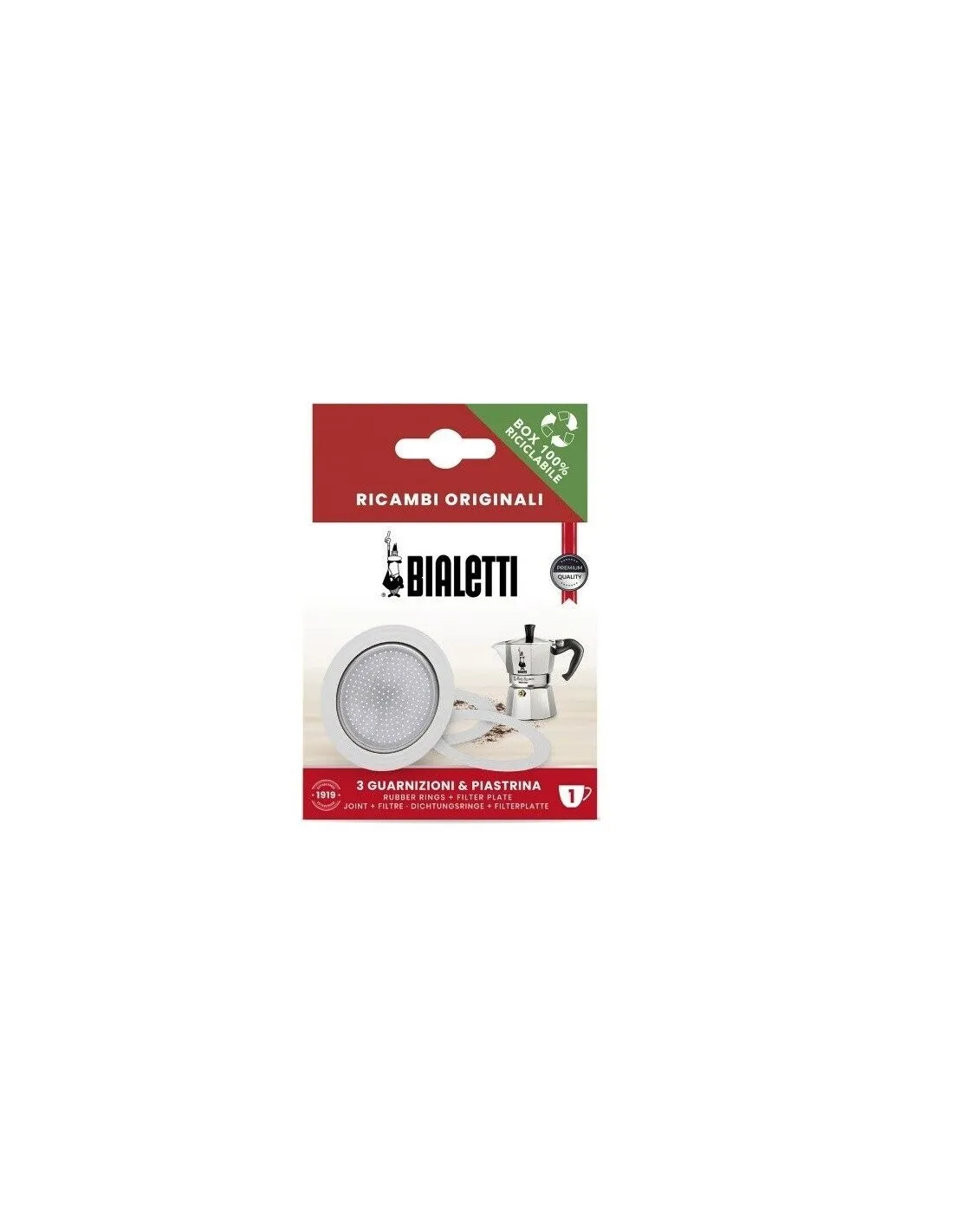 Sada 3 náhradných gumových tesnení s náhradným sitkom pre hliníkové moka konvice Bialetti s objemom 1 šálka.