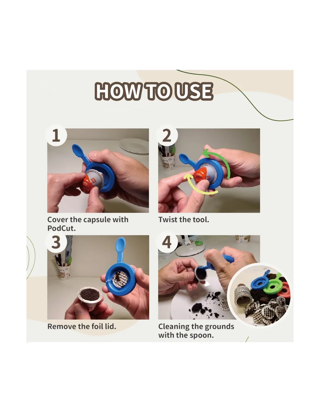 1) Umiestnite otvárač na plochú stranu použitej kapsuly. 2) Niekoľkokrát otočte v smere a proti smeru hodinových ručičiek. 3) Vyberte otvárač z kapsuly. 4)Pomocou lyžičky vyčistite kapsulu od použitej kávy. Hotovo :)